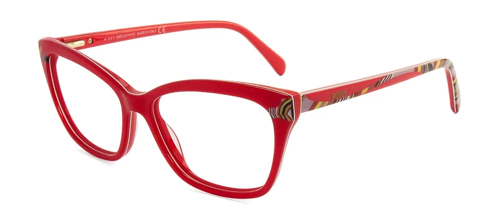 Óculos de grau com armação vermelha e formato gatinho. Tem um estilo extremamente sofisticado, ideal para mulheres de personalidade forte. As hastes têm estampas coloridas e a gravação da marca Pucci na lateral. Feito em acetato e com aro fechado.
